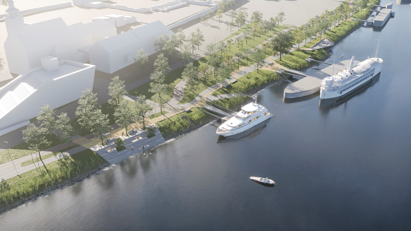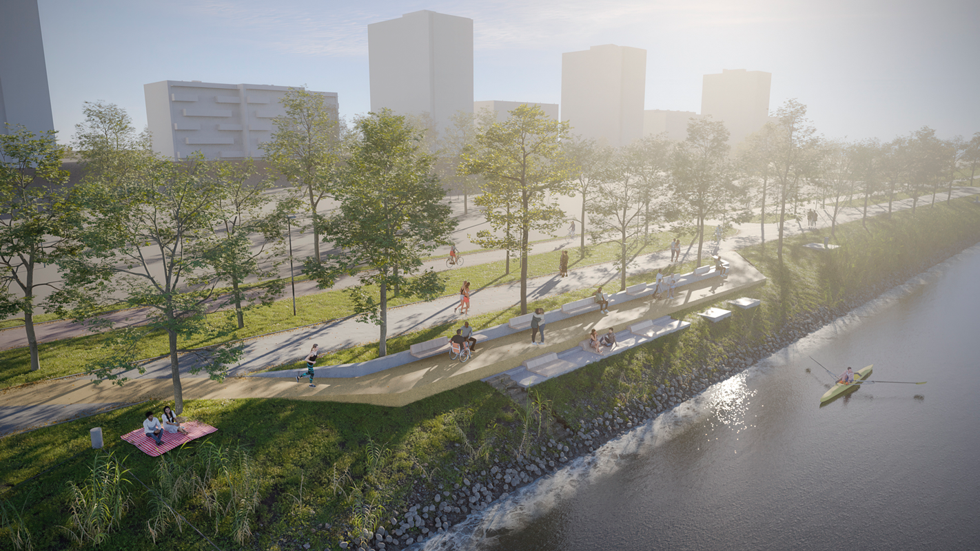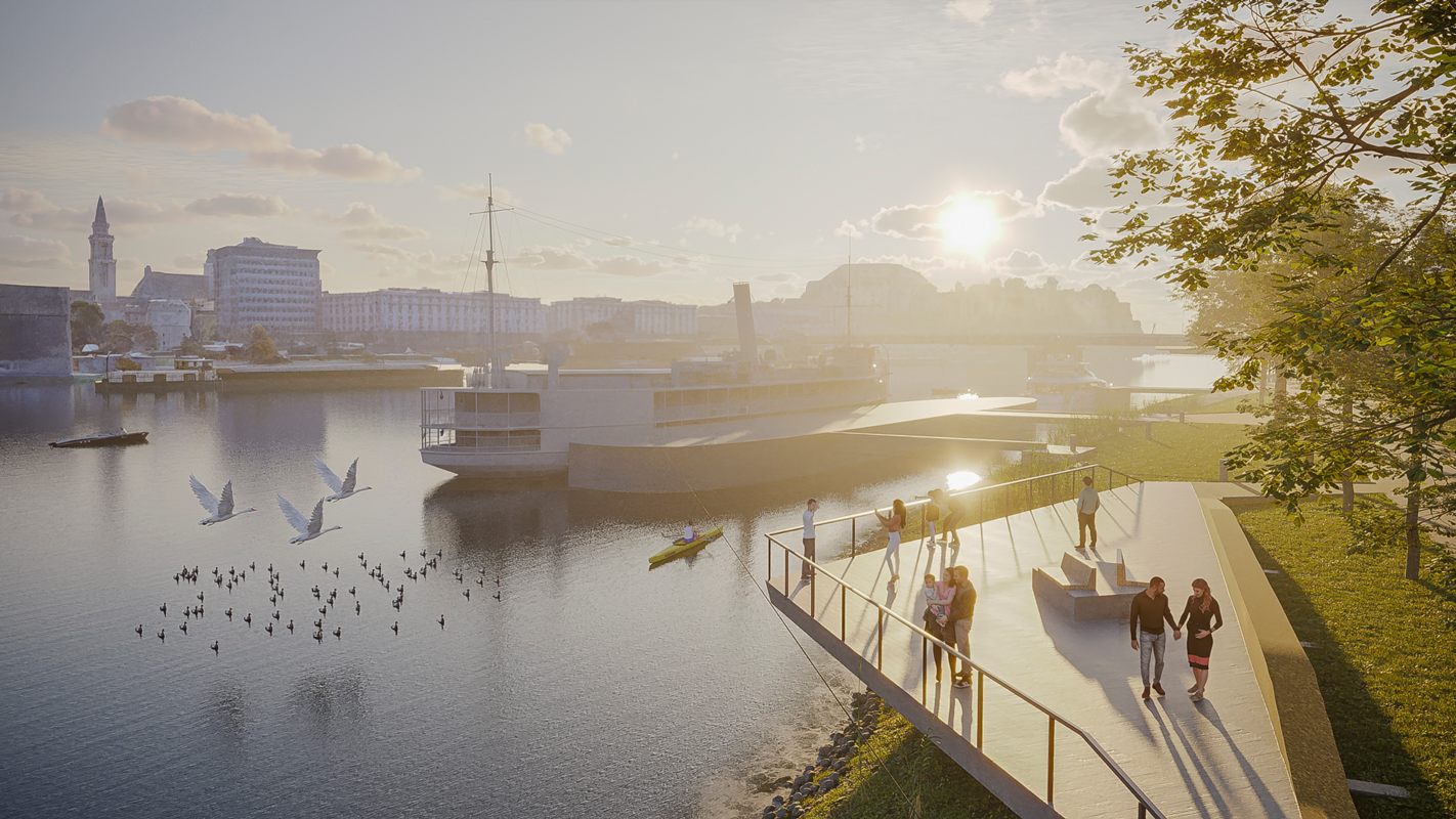 Inselprojekt Urfahraner Markt Urbaner Raum Landschaftsarchitektur Wasser Farbe Band Donau Aussenraumgestaltung Aufenthalt Sitzstufen Rendering