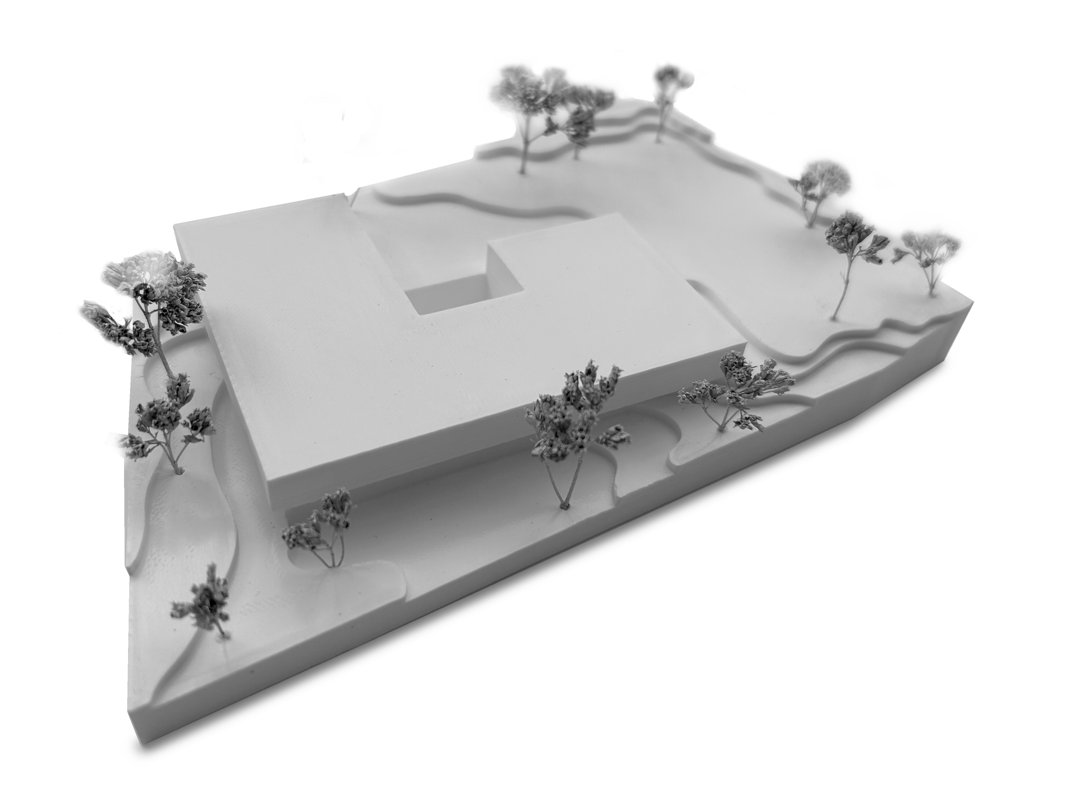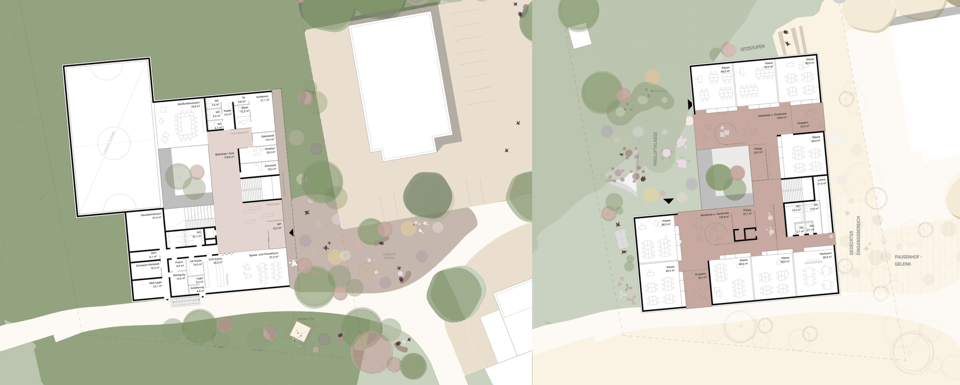 Durch die Platzierung und die Ausformulierung des zweigeschoßigen L-förmigen Baukörpers sowie die Setzung des vom restlichen Gebäude entkoppelten Turnsaales lassen sich im Freien gut aufgeteilt nutzbare ebene Flächen generieren. Das Dach des Turnsaales wird begrünt und wird Teil des Schulhofes.