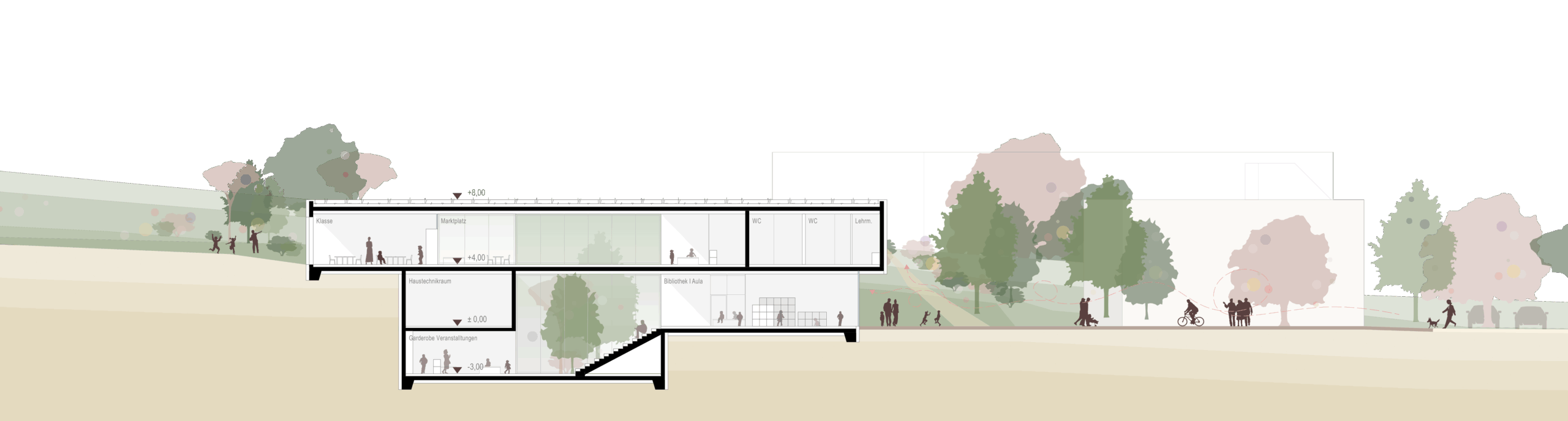 Durch die neue Topographie ergibt sich auch das Potenzial für eine gemeinschaftliche Nutzung des Außenraumes mit dem Kindergarten und eine angenehme Eingliederung des Verbindungsweges zur zukünftigen nördlichen Umfahrung.